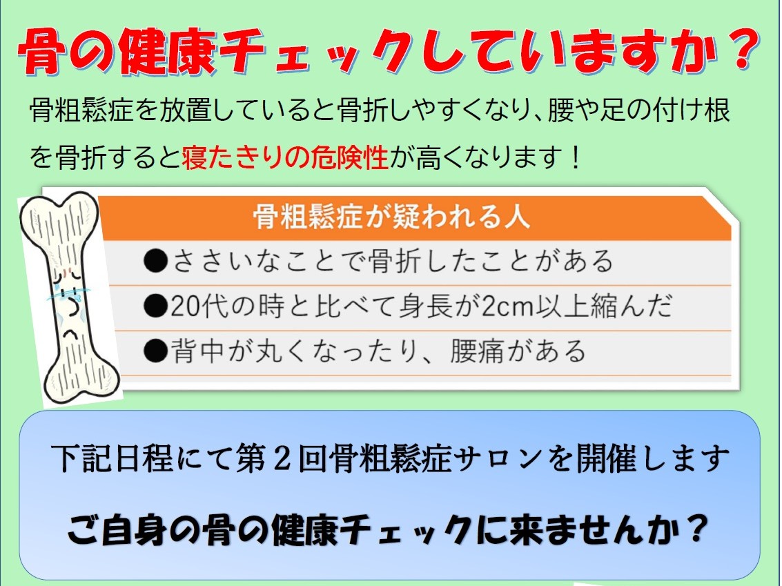 骨折は寝たきりの原因になります。毎週月曜午後 骨粗しょう症外来を行っています。受診ご希望の方は各科スタッフへお声かけください。電話での予約も可能です。