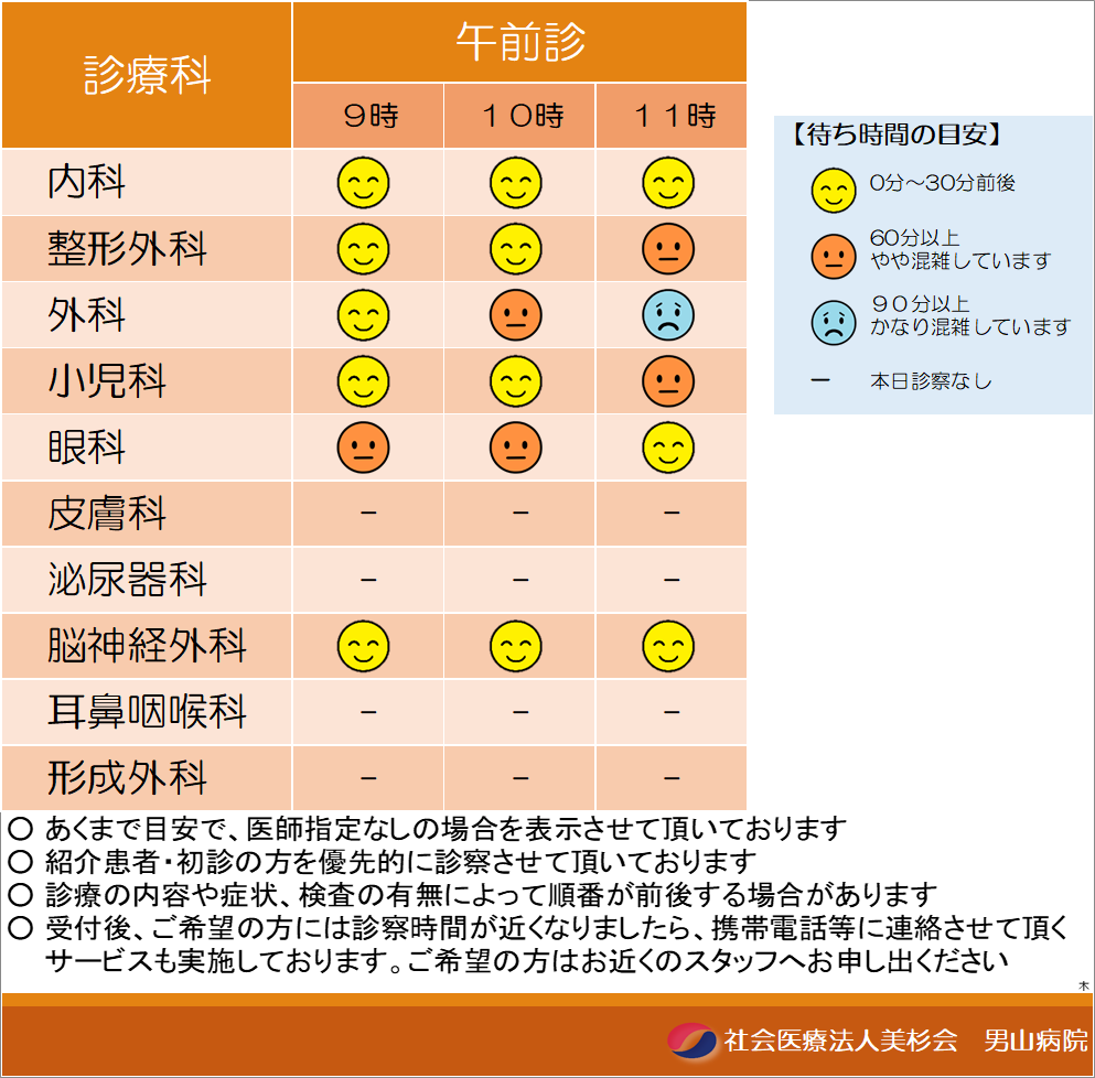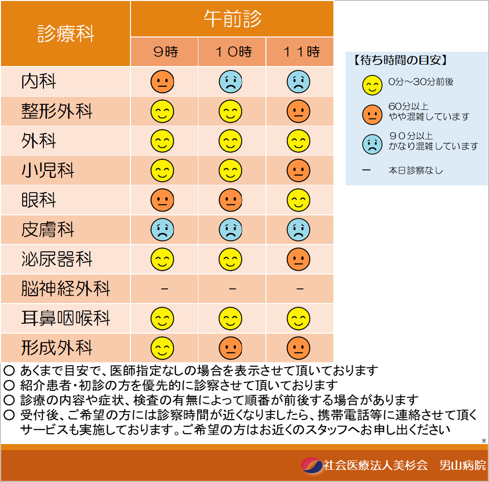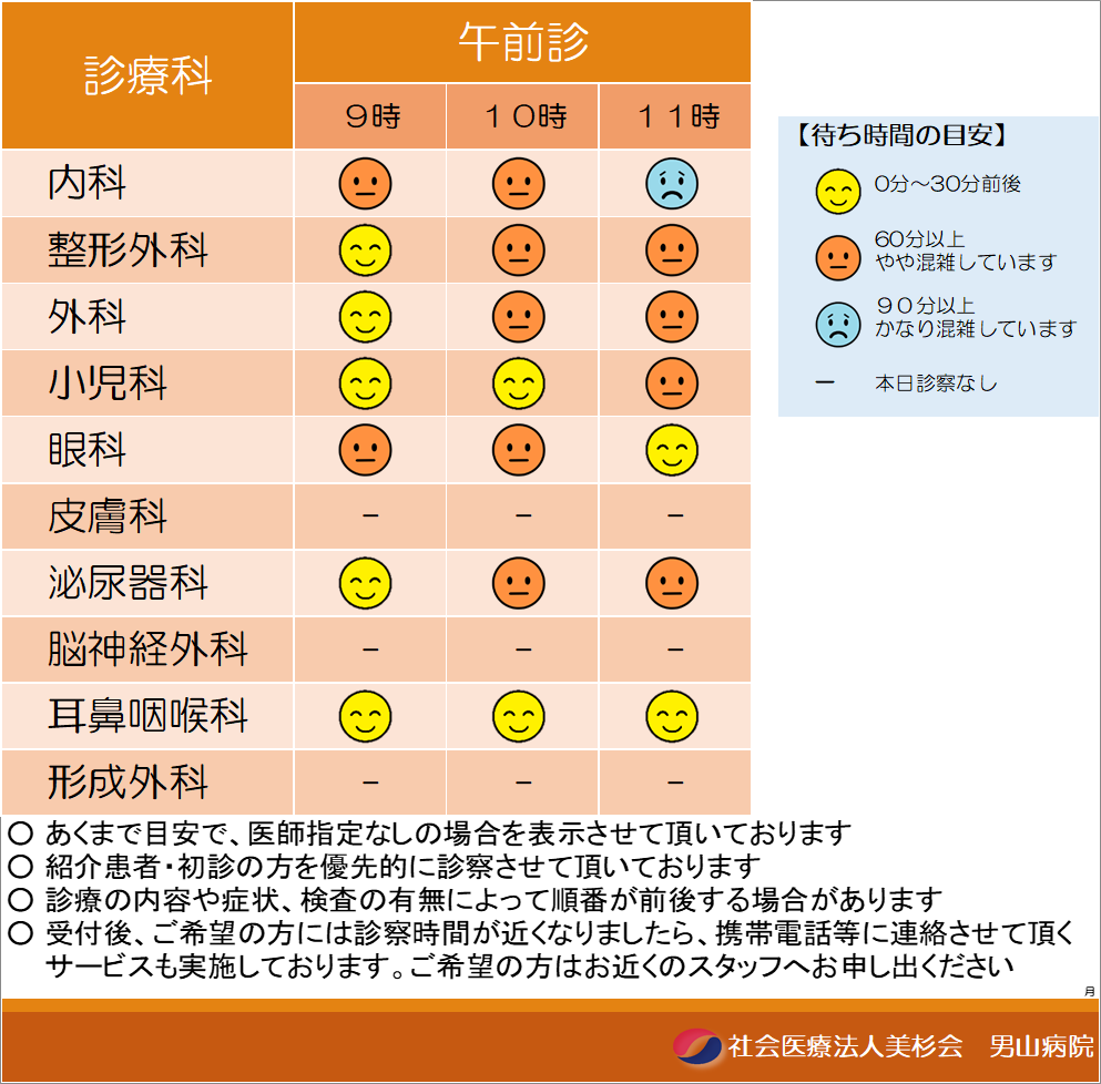 比較的待ち時間が少ない時間帯をご案内できるよう、混雑予想を月~土曜の9時に掲載しています。なお、混雑予想は、あくまでご来院の際の目安としてご利用頂きますようお願いします。