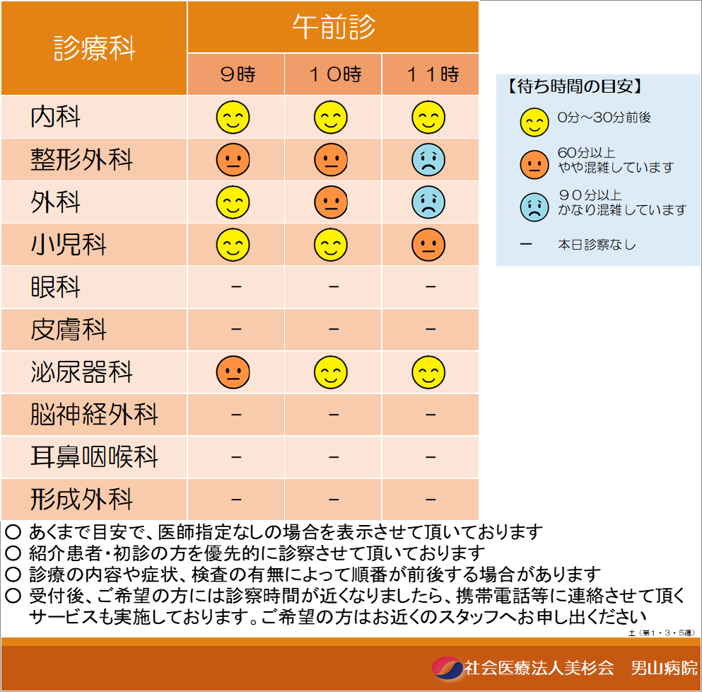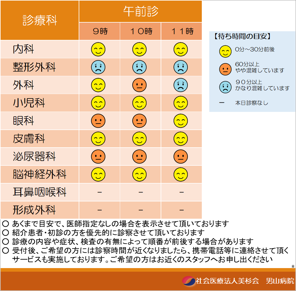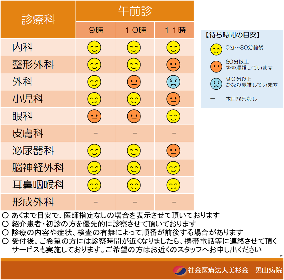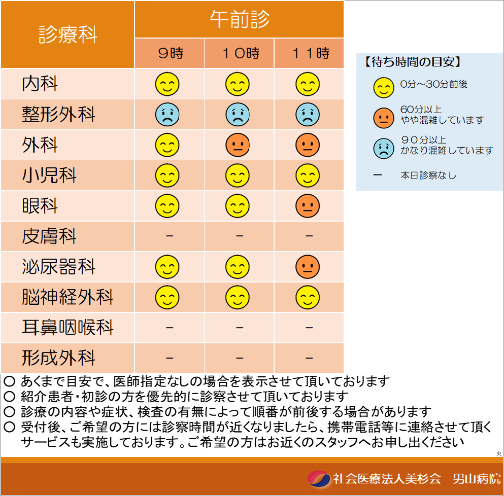 比較的待ち時間が少ない時間帯をご案内できるよう、混雑予想を月~土曜の9時に掲載しています。なお、混雑予想は、あくまでご来院の際の目安としてご利用頂きますようお願いします。