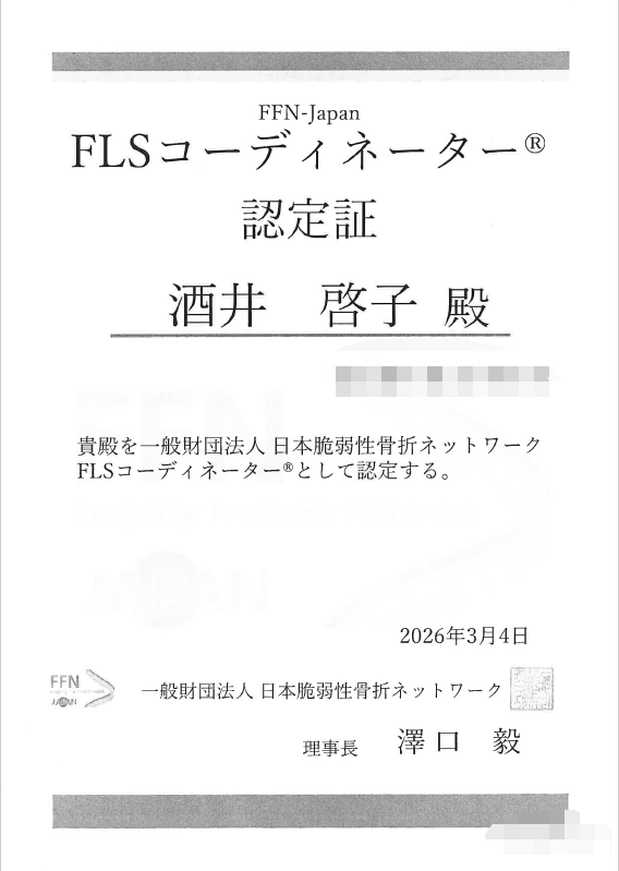 当院職員が一般財団法人 日本脆弱性骨折ネットワーク FLSコーディネーターに認定されました。