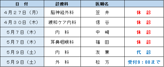 | 内科 | 総合 | 藤本 | 佐藤正 大城 | 春名 中村 大城 | 春名 藤井 井上 | 藤本 大城 | ||