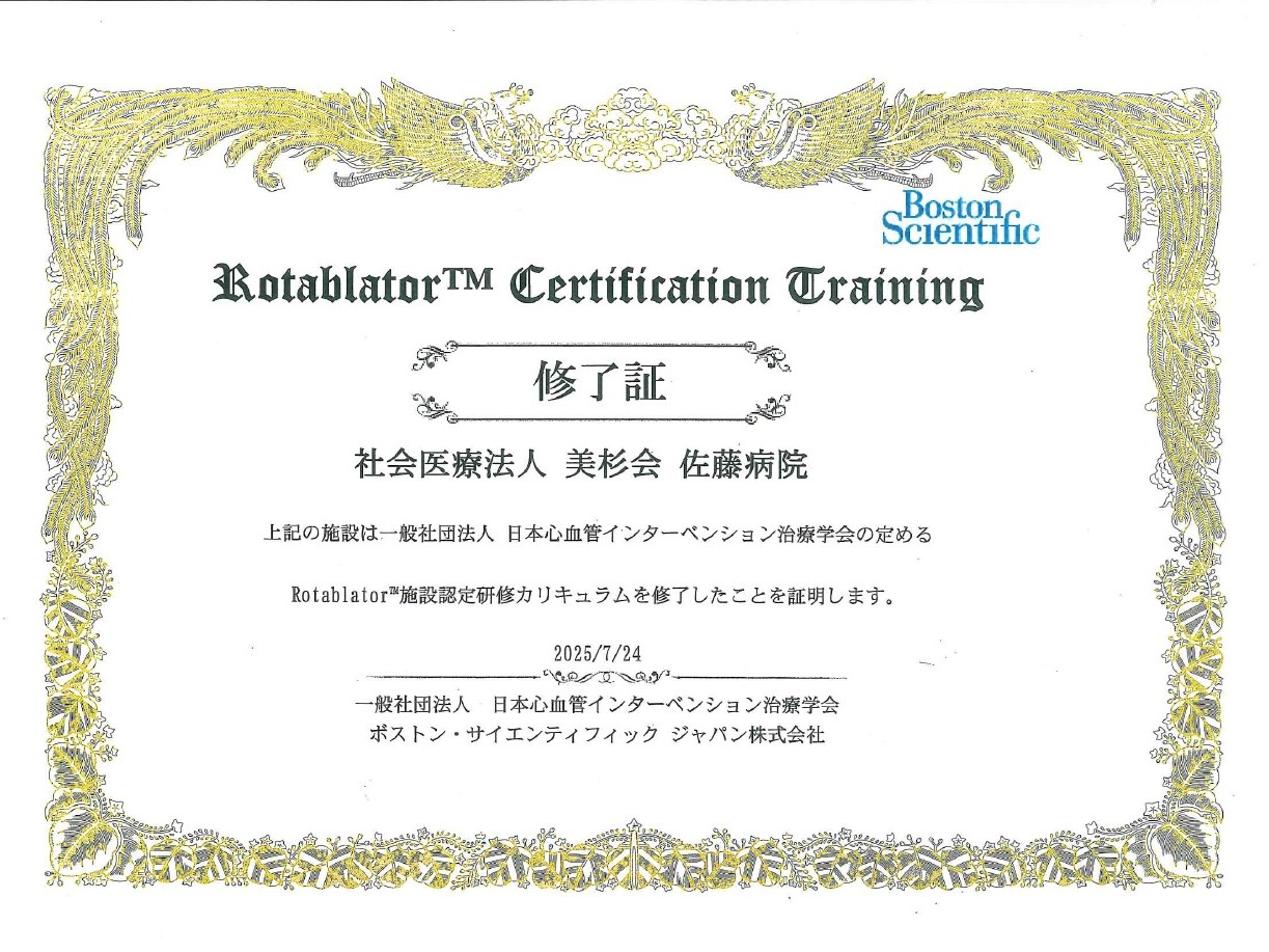 急性冠症候群(急性心筋梗塞や不安定狭心症)に対するカテーテル治療や、末梢動脈疾患に対するカテーテル治療はもちろんですが、とりわけ冠動脈多枝病変、高度石灰化病変、慢性完全閉塞病変などの複雑病変をお持ちの患者さんに対してカテーテル治療を中心に最適な血行再建ができるように、経験が必要とされる冠動脈石灰化を削るロータブレーターを駆使して治療したり、冠動脈の付け根に近いところに病変がある場合には病変を直接削る装置(DCA)を用いてステントを留置せずに治療したりする方法も取り入れ、“高度な医療”“あきらめない医療”をライフワークに、治療に取り組んでおりますので、他病院での困難例や、バイパス手術でしか治療手段がないような冠動脈病変でも、カテーテル治療が可能なことが十分ありますので治療にお悩みの方は、気軽にご相談下さい。